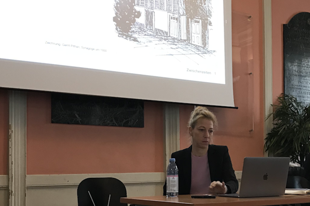 Die Schändung der ehemaligen Synagoge soll an Hand authentischer Zeugnisse der Überformung durch die Schlosserei anschaulich werden.
